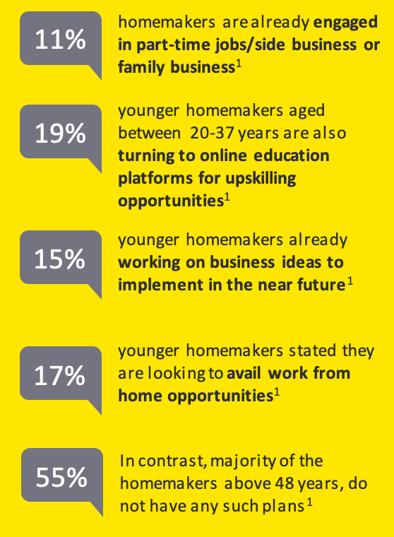 As per a recent study assessing the lives of homemakers from Tier-1 cities, 19% of homemakers aged between 20-37 years frequently take up online courses to upskill themselves, while around 15% are in the process of ideating and developing their business strategies. However, 55% of the homemakers aged 48 and above showed no noteworthy interest in starting businesses.